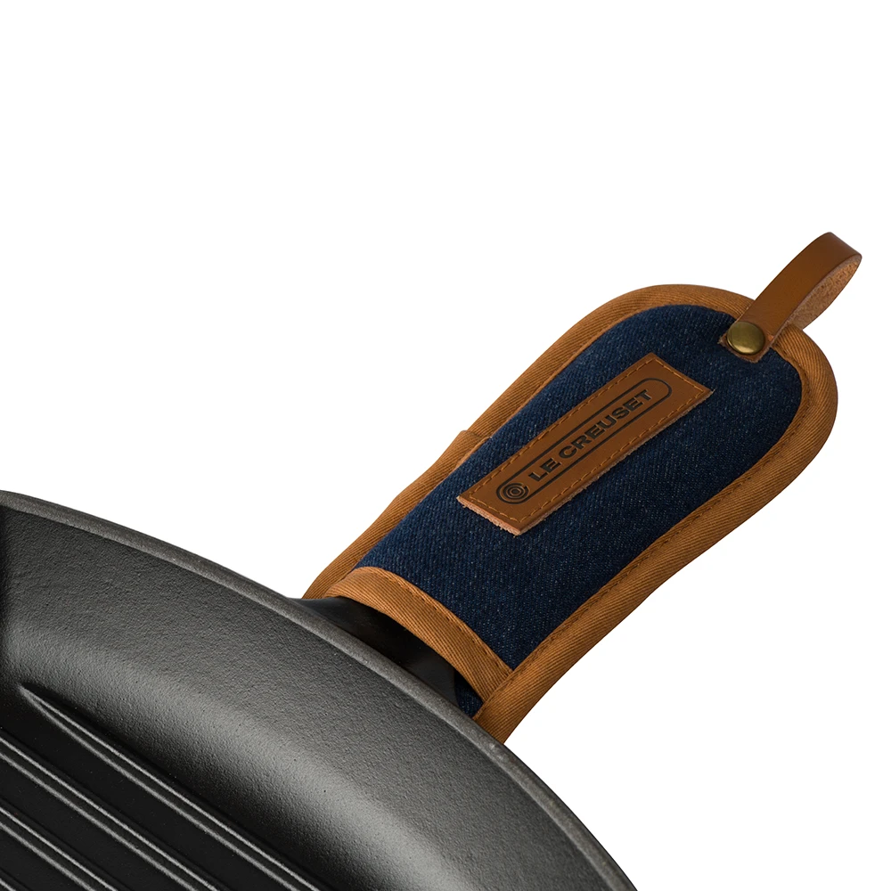 Der Griffüberzug ist unerlässlich beim Einsatz von Pfannen mit Gusseisengriff. Im Denim-Look aus Jeansstoff ist der Griffüberzug ein modisches Accessoire. Das Logo ist aus echtem Leder