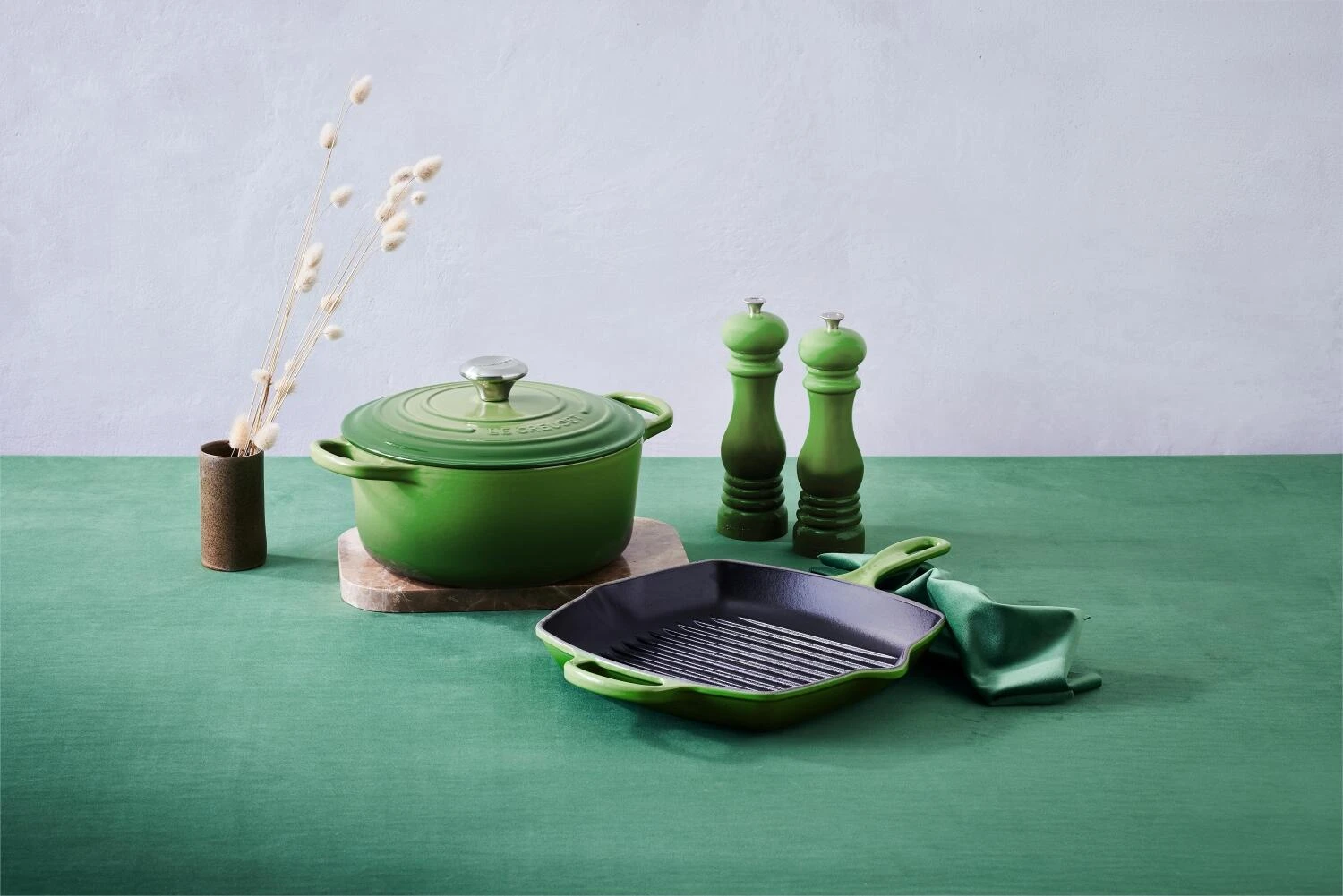 Le Creuset Grillpfanne SIGNATURE quadratisch in Bamboo Green. Ideal zum krossen, knusprigen Braten von Fleisch mit den typischen Grillstreifen.