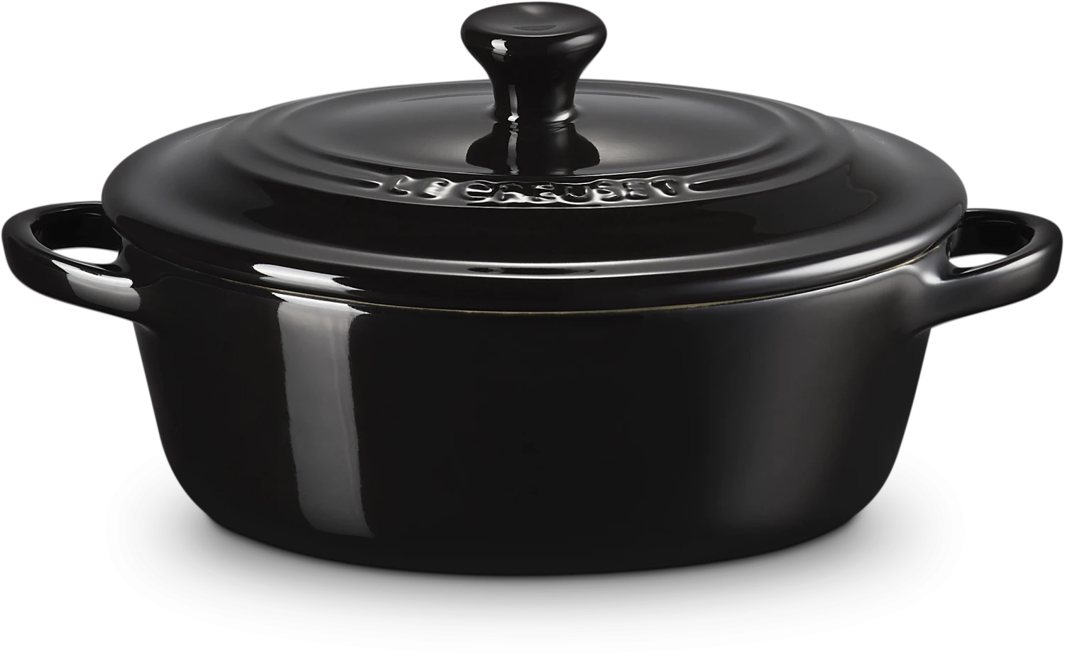 Le Creuset Mini Cocotte oval in schwarz. Ovales Serviertöpfchen für den vielfältigen Einsatz.
