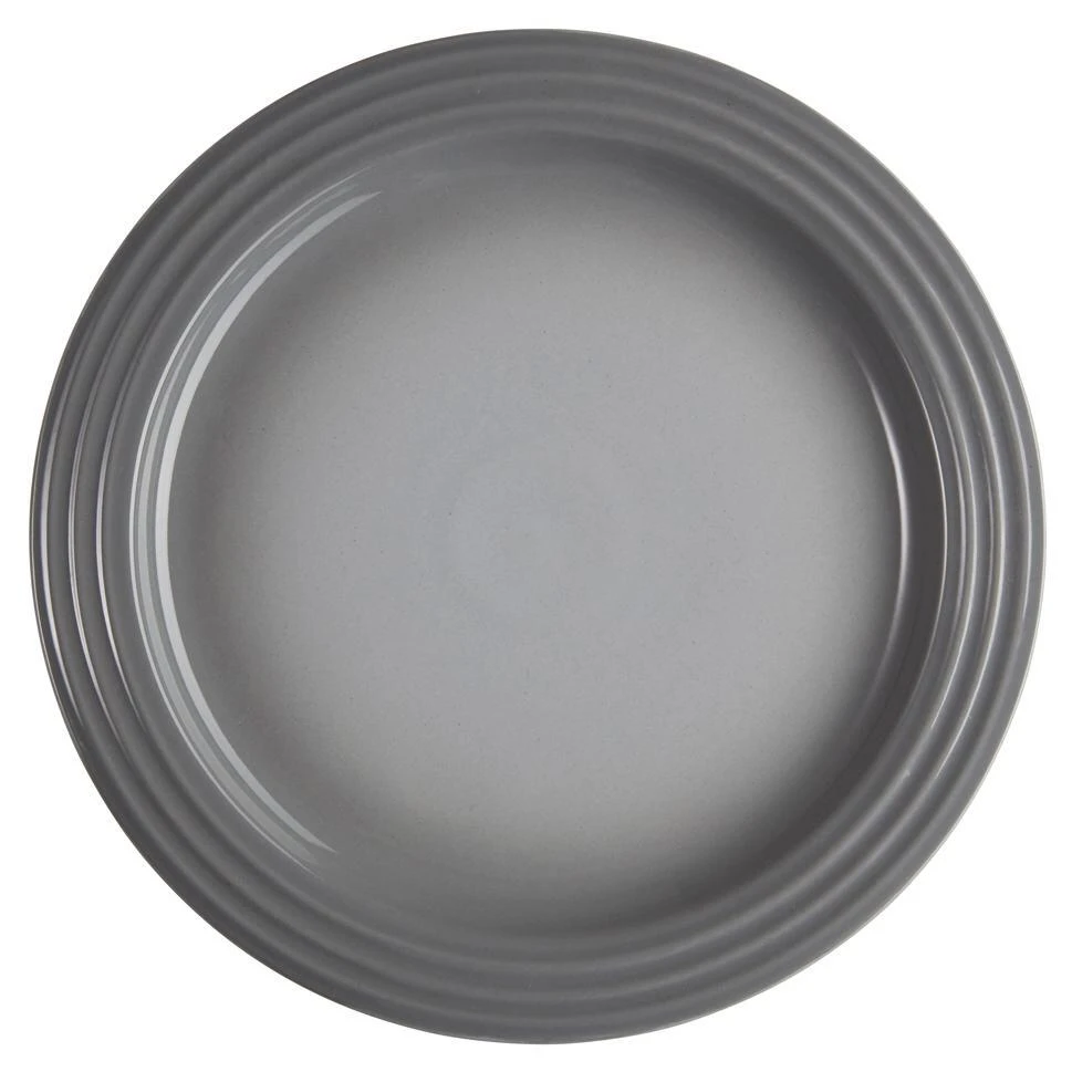 Le Creuset Teller in perlgrau. Der Teller eignet sich sowohl zum Servieren eines mehrgängigen Menüs als auch zum angemessenen Präsentieren des Essens am Sonntagmittag.