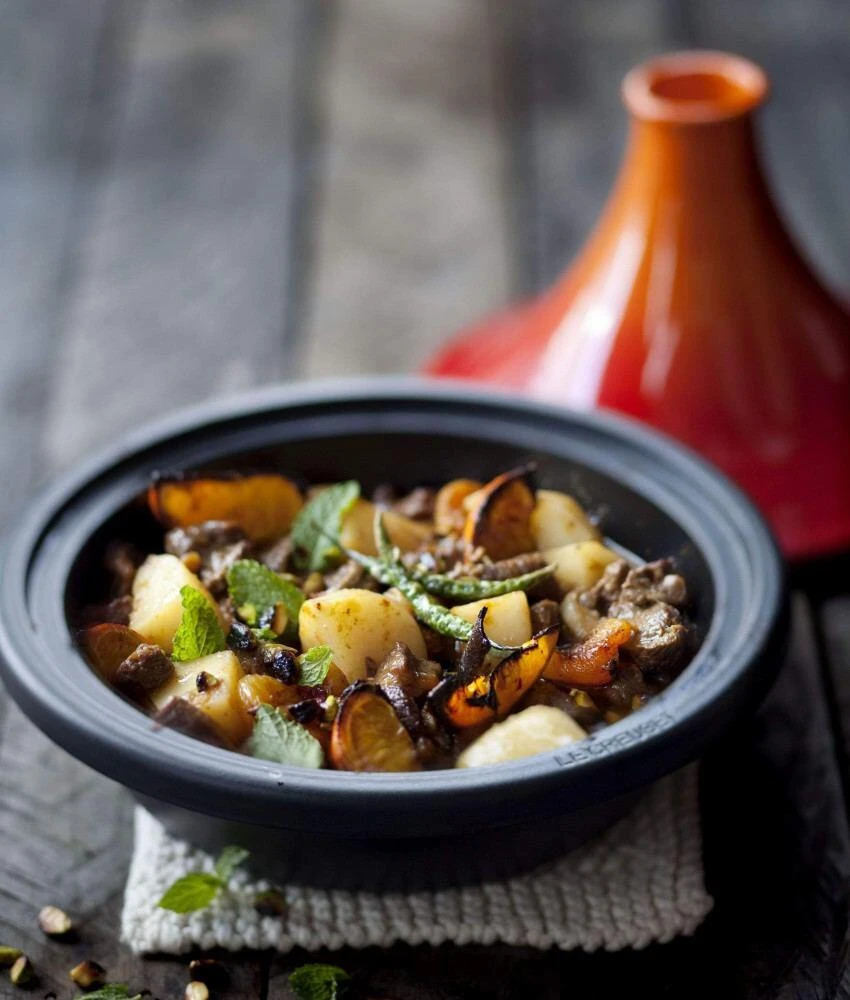 Die Tagine ist eines dieser kulinarischen Highlights, das die nordafrikanische Küche bietet. Den Namen verdankt die Tagine – ein traditioneller, orientalischer Eintopf – dem speziellen Gefäß, in dem alles zusammen gegart wird. Typisch ist der kegelförmig gewölbte Deckel über einer flachen Kochschale. Der obere Teil ist weiter von der Hitze entfernt und bleibt kühler. So kondensiert der aufsteigende Dampf, der sich am Deckel niederschlägt, und tropft zurück auf die Speisen. Das ermöglicht ein langsames, sanftes Garen im eigenen Saft ohne viel Flüssigkeit. Das im Innern herrschende feuchte Klima macht Fleisch herrlich zart und schont empfindliches Gargut, zugleich werden auch die wertvollen Geschmacks- und Nährstoffe darin eingeschlossen.