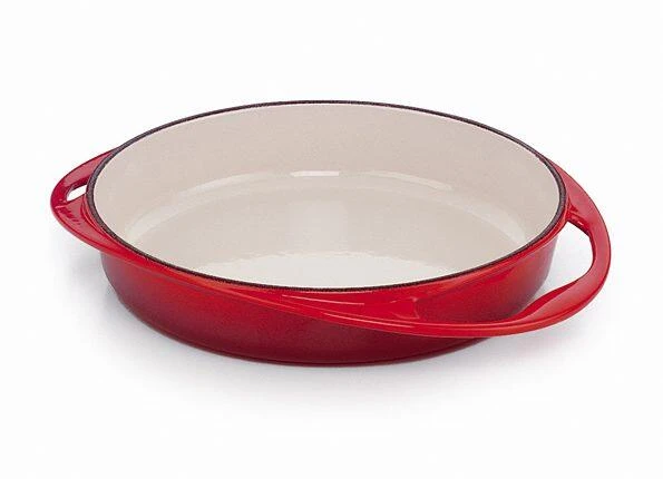 Backform in kirschrot. Die Tatin-Backform erkennen Sie an den großen geschweiften Handgriffen, die das Stürzen des Kuchens erleichtern. Durch den leicht gewölbten Innenboden, den abgerundeten Rand und die extraglatte, sandfarbene, schnittfeste Innenemaillierung löst sich die Backware leicht aus der Form.